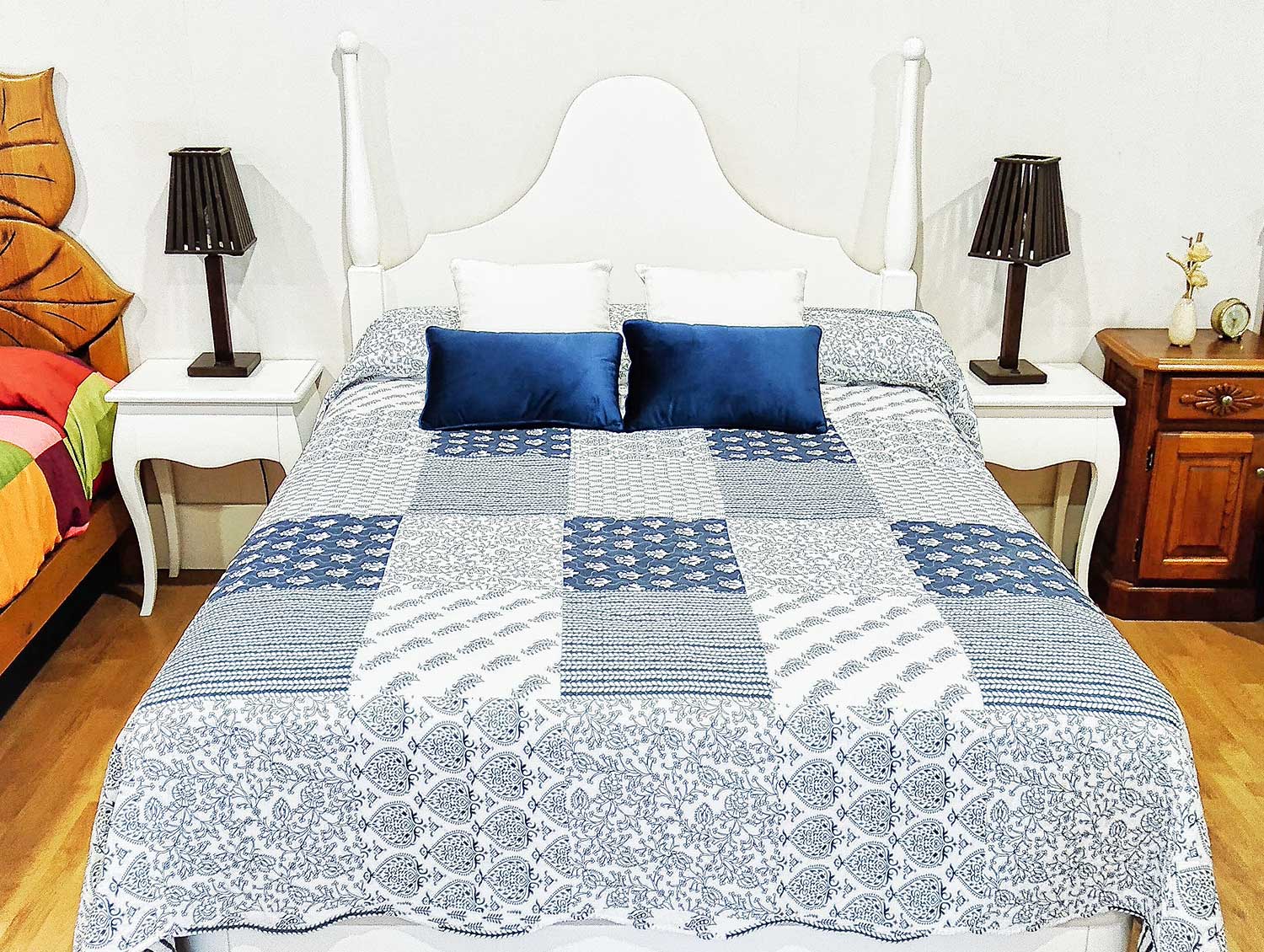 Descripción de cama arcón con cabecero torneado y dos mesas de noche.