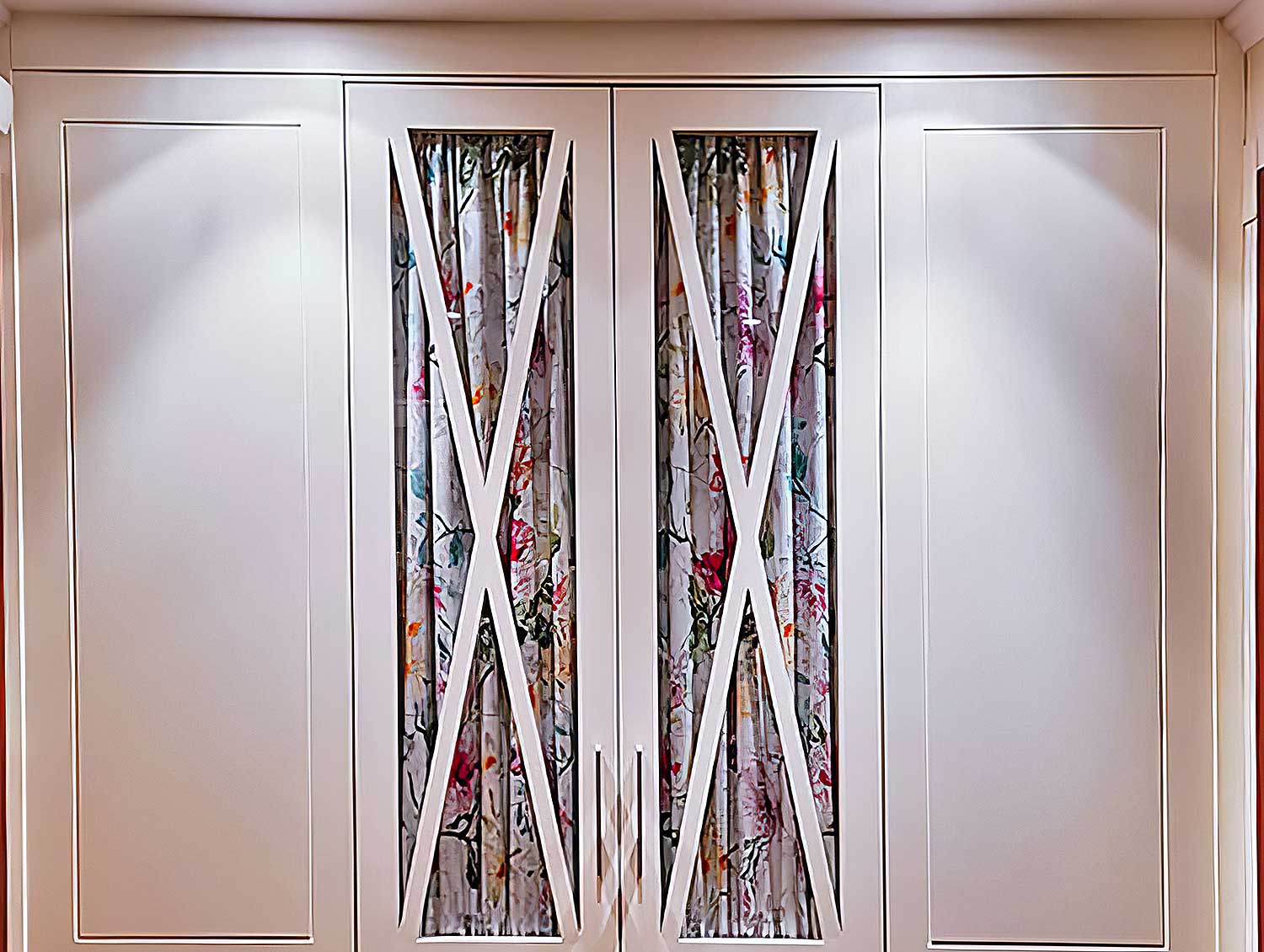 Armario batiente en DM laca blanca, con puertas enmarcadas, panel liso, dos marcos con aspa y cristal transparente.