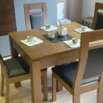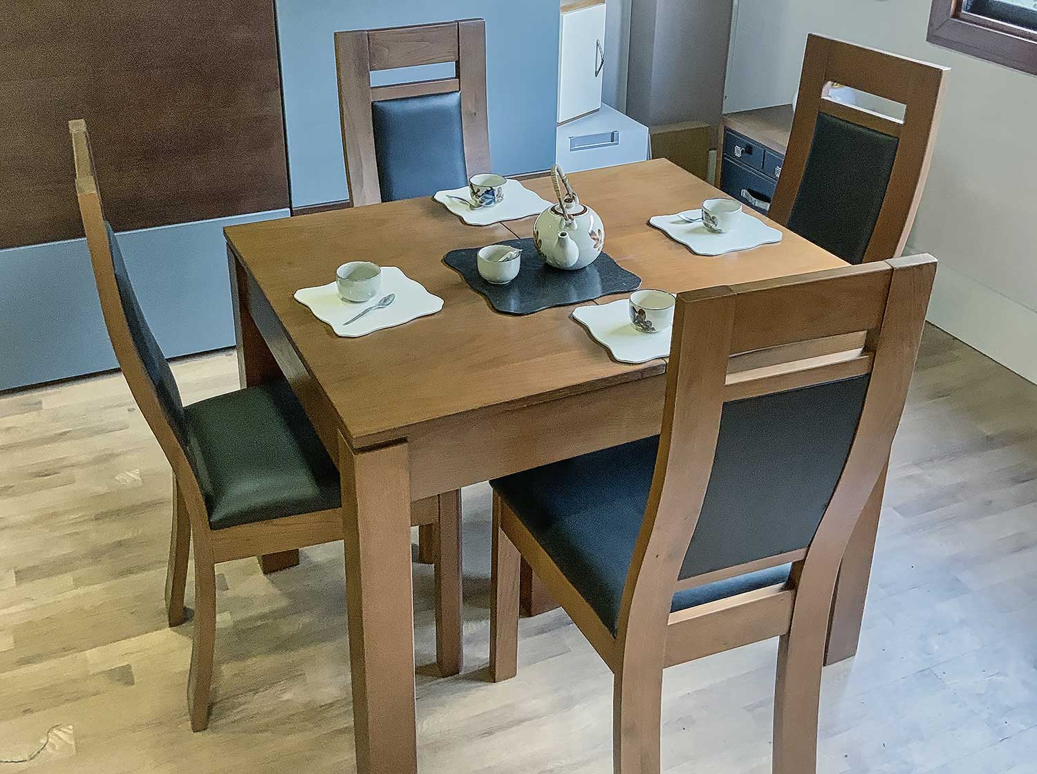 Elaborada en madera de castaño de máxima calidad con cuatro sillas tapizadas